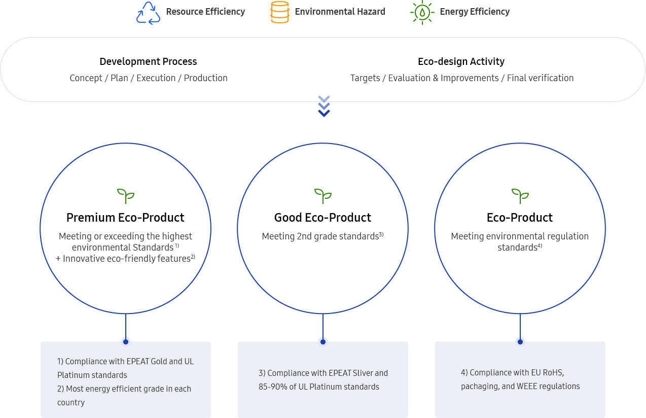 <h3>Eco-product ratio plan</h3> <p>This image describe Samsung Electronics manages eco-product development ratio as our performance indicator. It evaluates the environment aspects of a product is evaluated by product developers according to eco-design process. The result is classified into three levels: Premium Eco, Good Eco, and Eco. We are striving to have 90 percent of new development projects receive the Good Eco-Product stamp of approval or higher by 2020.</p>Eco-Product RatioSamsung Electronics manages eco-product development ratio as our performance indicator. It evaluates the environment aspects of a product is evaluated by product developers according to eco-design process. The result is classified into three levels: Premium Eco, Good Eco, and Eco. We are striving to have 90 percent of new development projects receive the Good Eco-Product stamp of approval or higher by 2020. -