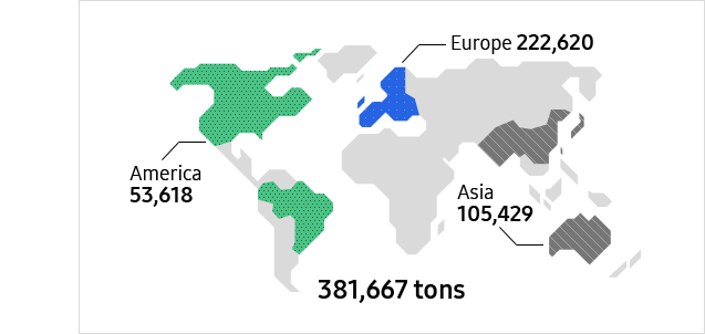 <h3> 2016 regional take-back quantity</h3> <p>This image describe 2016 regional take-back quantity. List 1) 53,618 in America. List 2) 222,620 in Europe. List 3) 105.426 in Asia. List 1)+List 2)+List 3) amount 381.667.</p>[ 2016 Regional take-back quantity(tons) ]