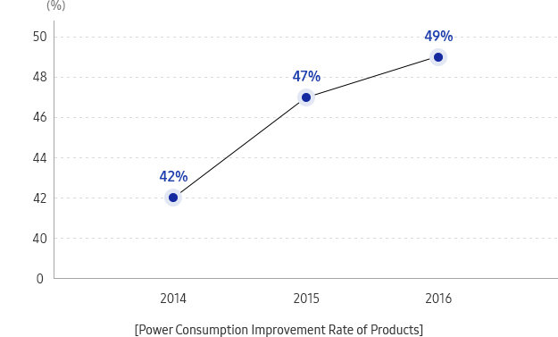 Developing the most energy efficient products and solutions.Samsung continuously develops highly energy efficient products and strives to meet or exceed higher standards than global energy regulations. We systematically and comprehensively evaluate the sustainability performance of our products through our eco-rating system. In doing so, we work hard to reduce power consumption and GHG impacts generated during the product use stage.