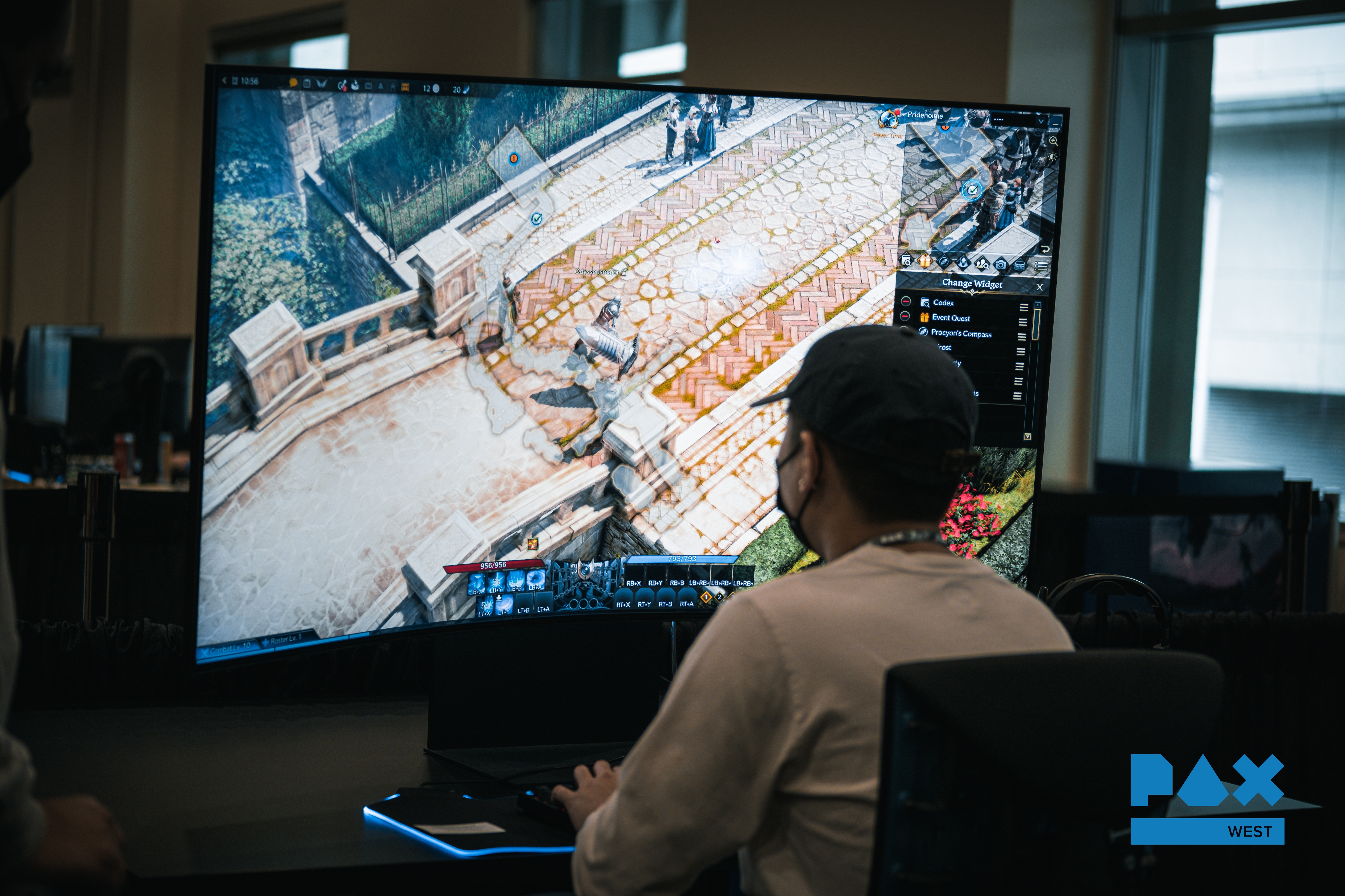 There is a man playing a game and the camera focuses in on his eye. Then, the angle goes through a portal, and a gaming scene appears. The Lost Ark logo is in the gaming scene.